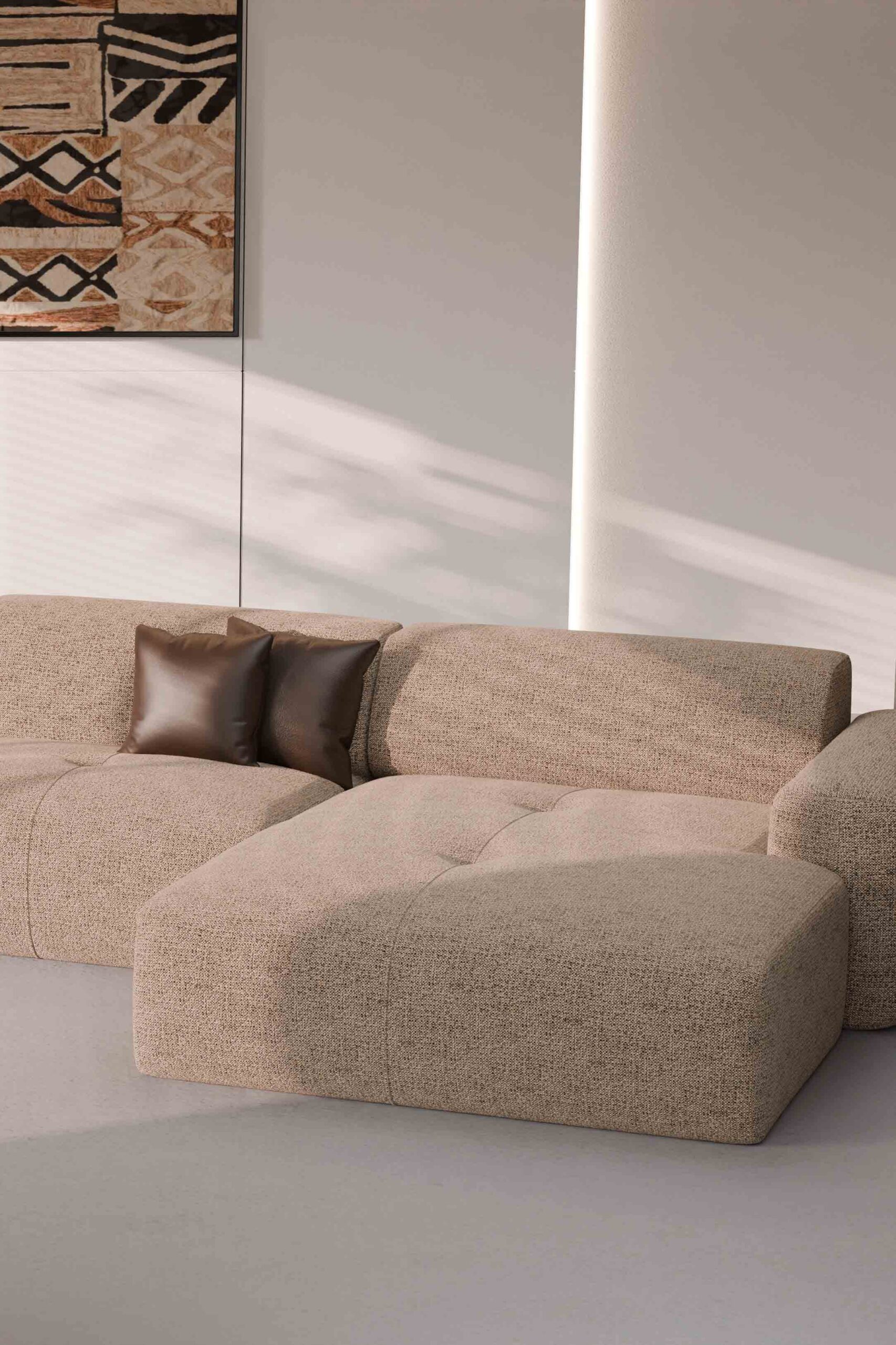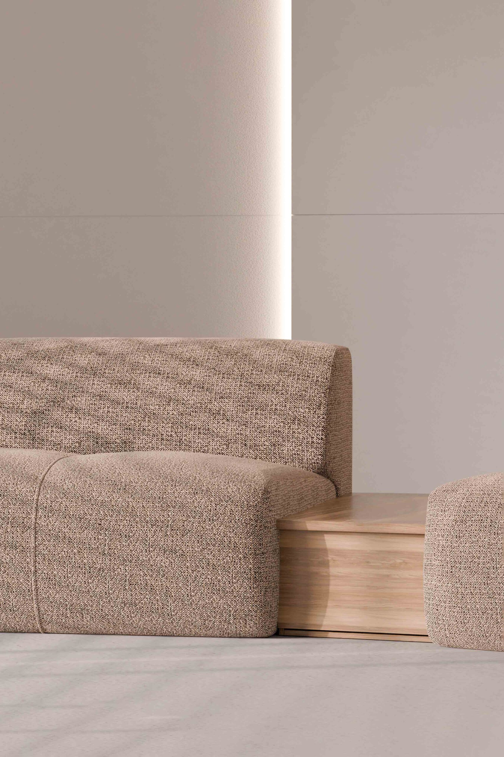 Seine charakteristische Optik verdankt der Stoff weichen, voluminösen Chenille-Garnen im Schuss sowie einem dunkleren Garn in der Kette, was einen subtilen dreidimensionalen Effekt und farbliche Tiefe erzeugt. Diese ausgewogene Garnkomposition verleiht dem Stoff einen warmen, eleganten Charakter – ideal für moderne ebenso wie klassische Einrichtungskonzepte.